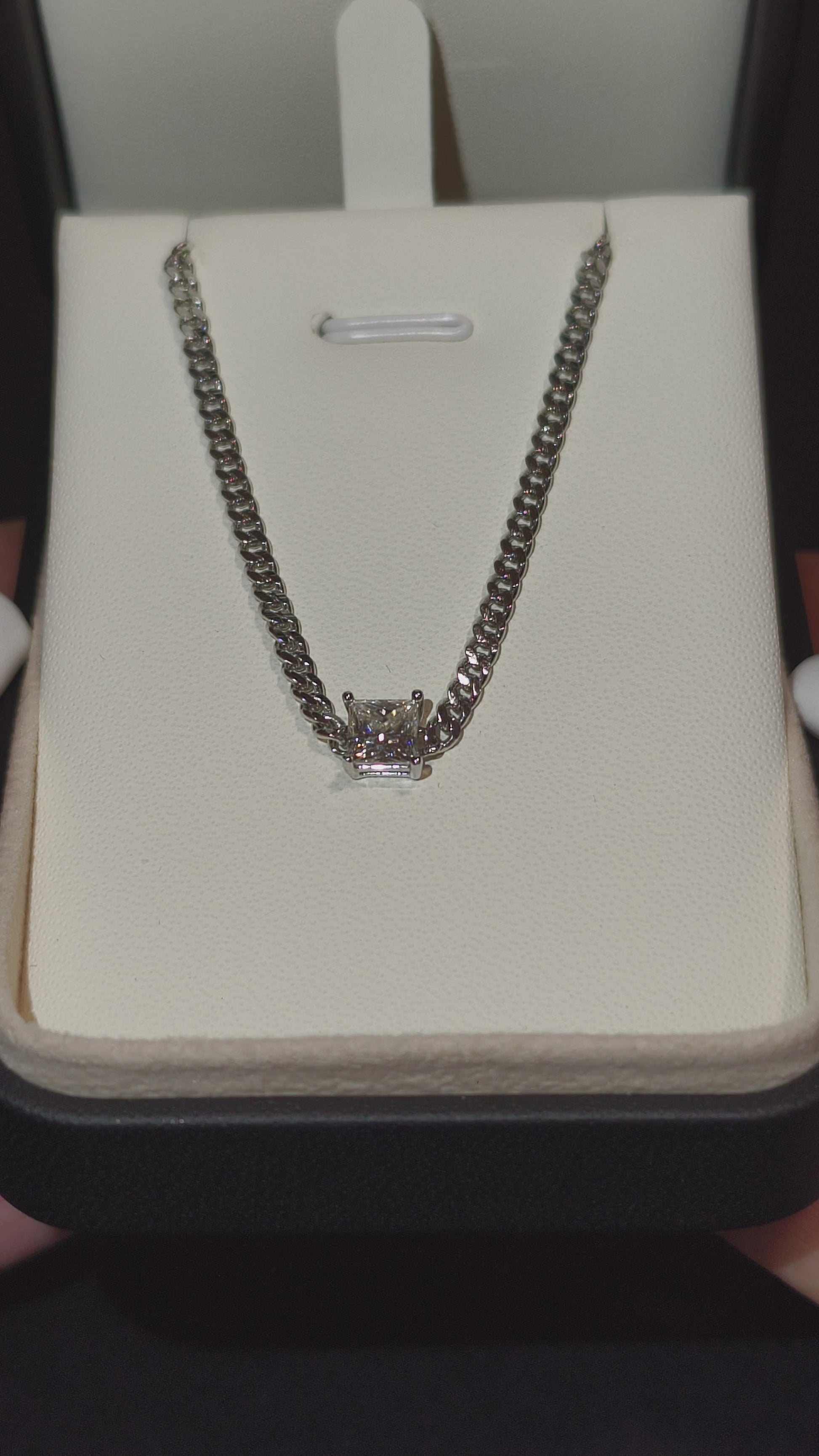Dizajn: lančani dizajn sa centralnim Princess Cut Moissanite kamenom 1ct koji naglašava geometrijsku eleganciju i luksuznu jednostavnost