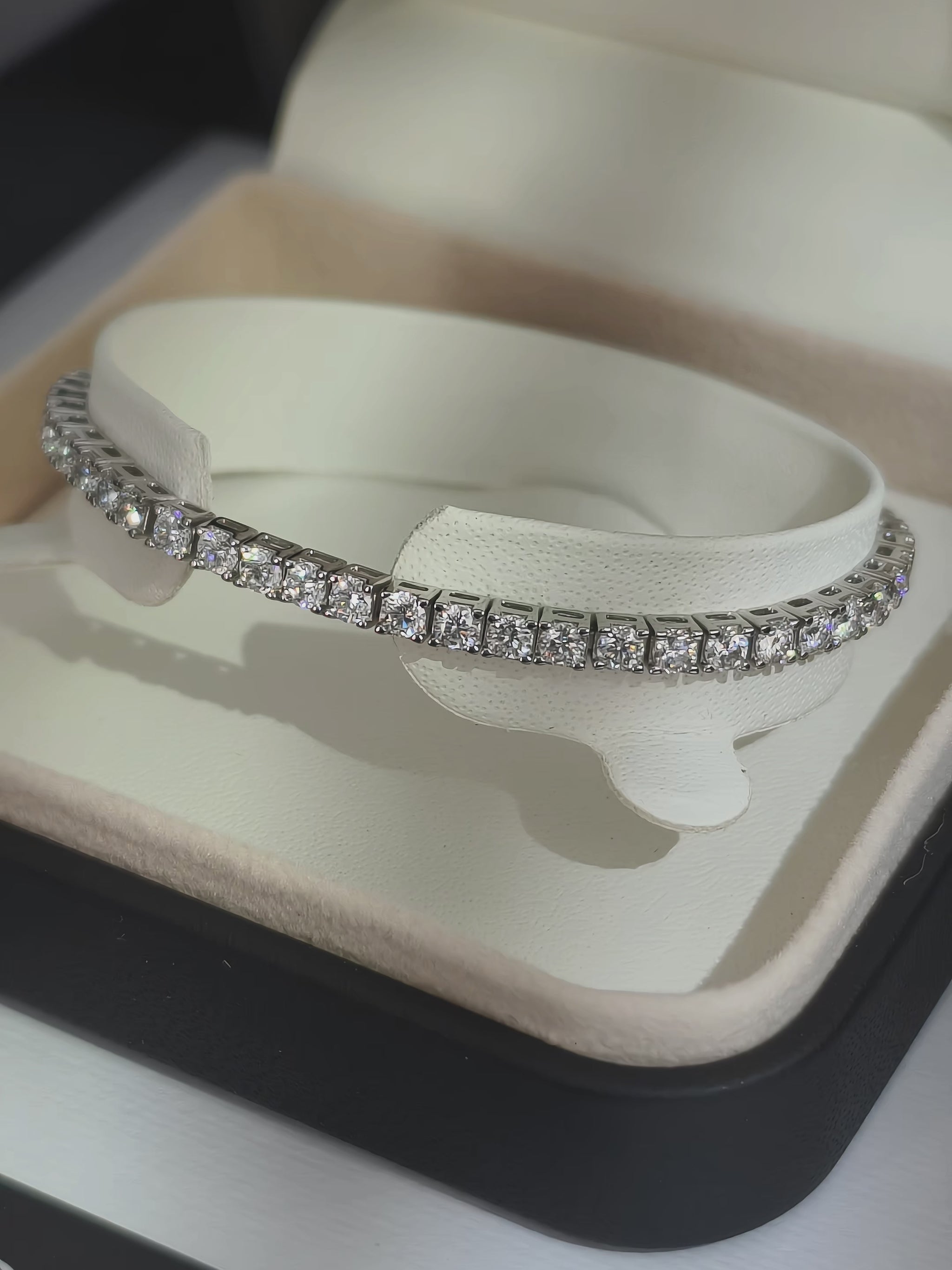 La Séductrice je linijski čista Moissanite tennis narukvica, sa ritmičnim sjajem 53 briljantno sečenih Moissanite dragulja od 3 mm (≈ 5 ct). Svaki kamen hvata svetlo i vodi ga dalje, stvarajući kontinuirani niz zavodljive svetlosti.