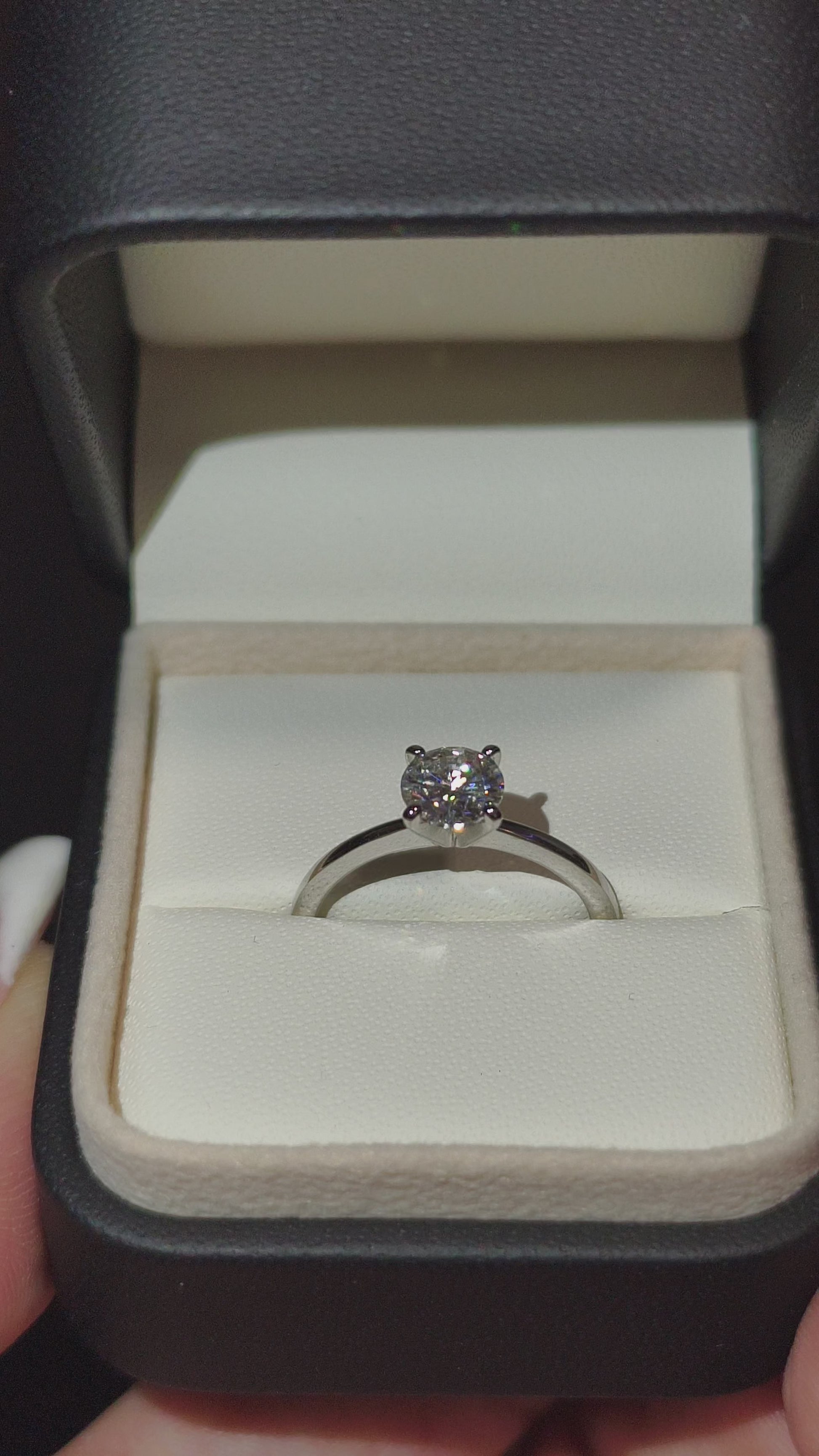 Dizajn: klasičan soliter sa centralnim Moissanite kamenom koji reflektuje svetlost kroz savršenu simetriju brušenja