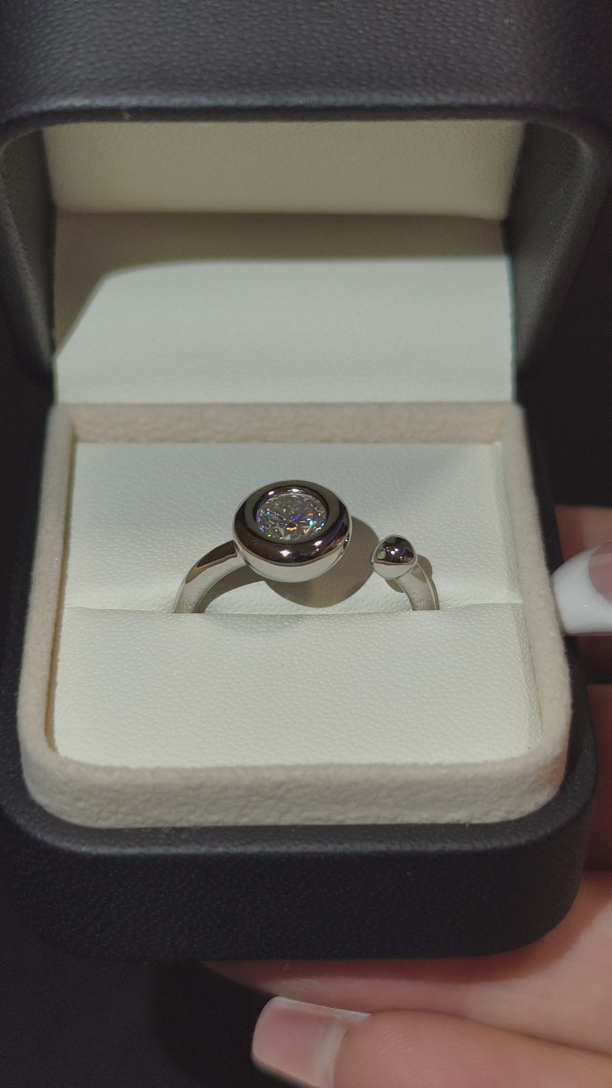 Dizajn: otvoreni minimalistički prsten sa lebdećim centralnim kamenom koji odražava spoj savremenog i mističnog luksuza