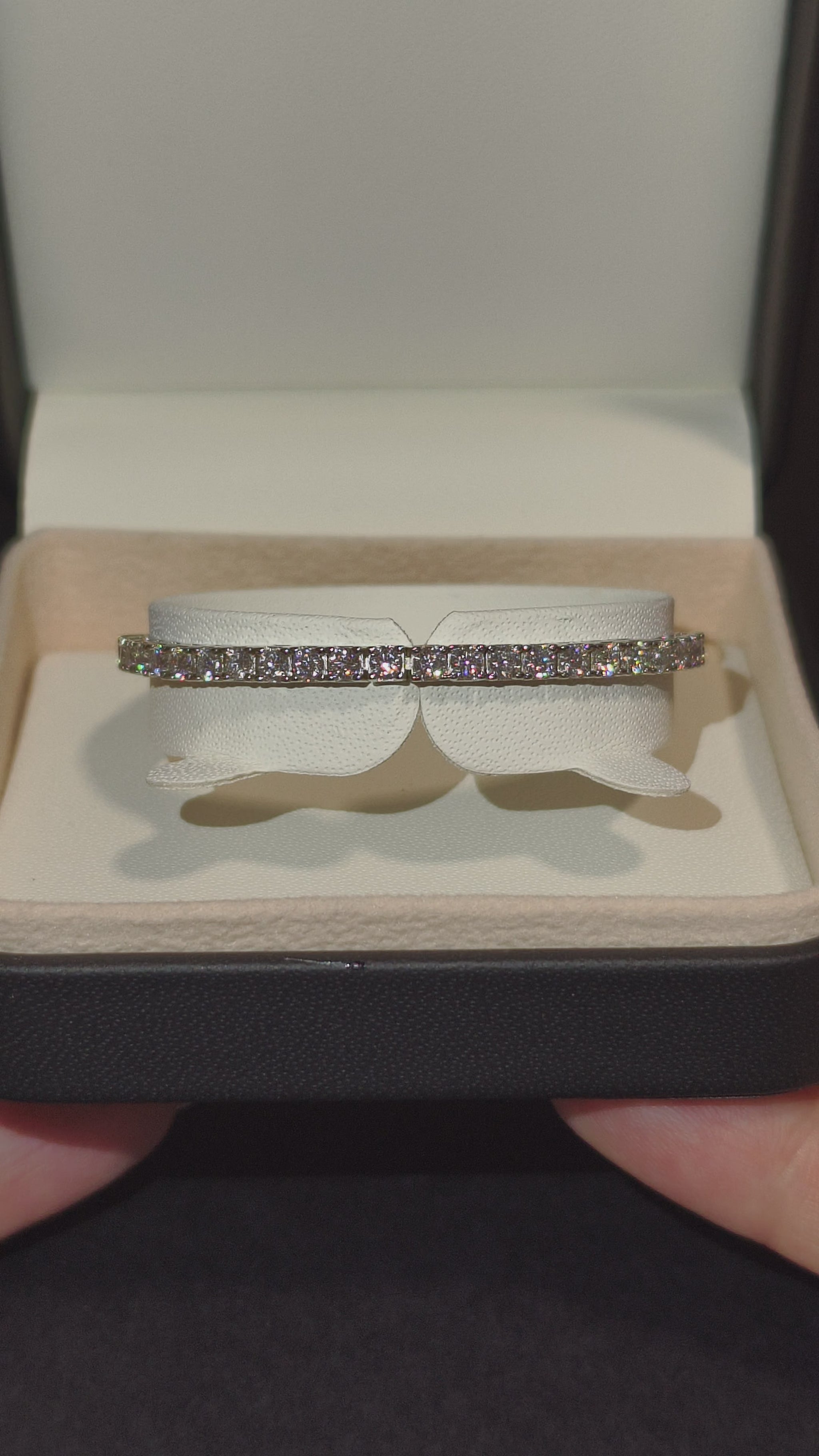 Uniformni niz okruglih Moissanite kamenova (≈ 5 ct ukupno) u tankom, savršeno uravnoteženom profilu. Izbor dužine — 16,5 cm ili 18 cm — omogućava prirodno prijanjanje uz zglob, od dnevnog tailoring-a do večernjeg satena. Svaki kamen je postavljen da uhvati svetlo iz svakog ugla: tih luksuz, izgovoren bez ijedne reči.